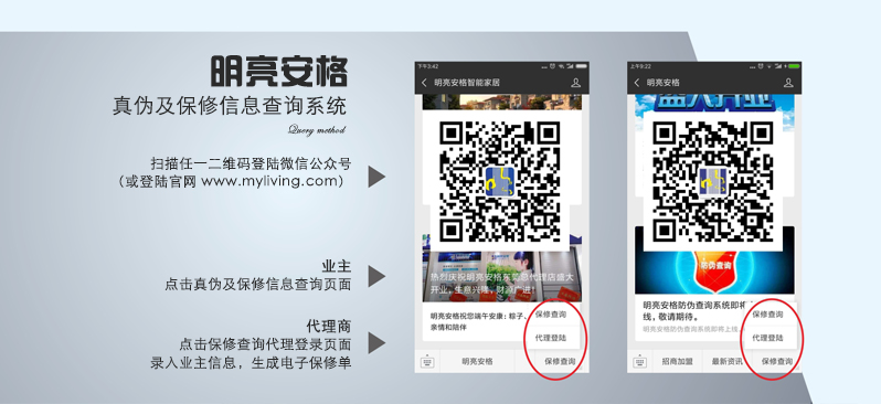 明亮安格公司緊跟時(shí)代發(fā)展,建立電子保修服務(wù)系統(tǒng),全國(guó)連網(wǎng)數(shù)據(jù)庫(kù)支持,正品保證,手機(jī)上即時(shí)錄入與查詢(xún),讓安裝信息一目了然,可以為客戶(hù)提供更優(yōu)質(zhì)服務(wù)的同時(shí),使客戶(hù)更有歸屬感,信任感。